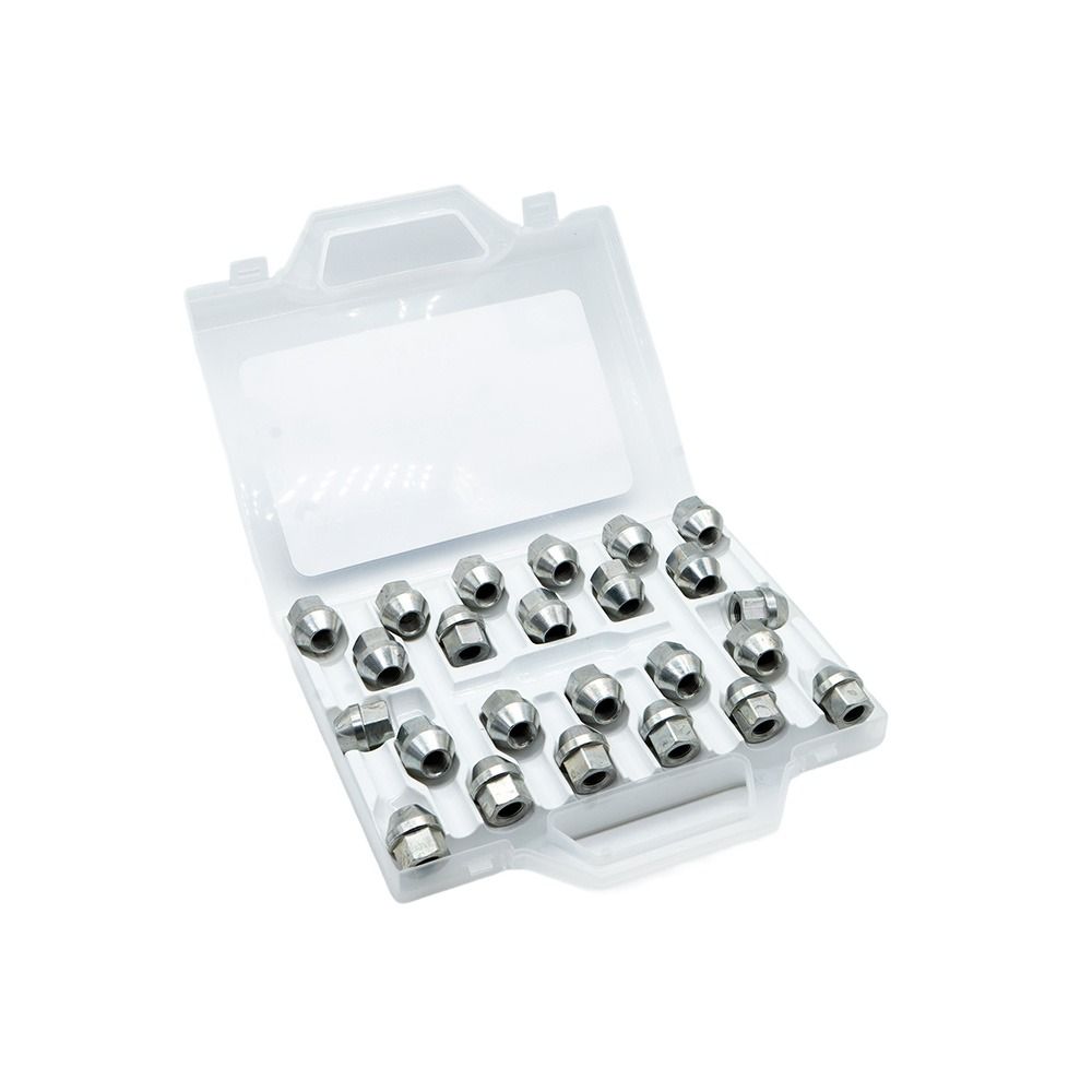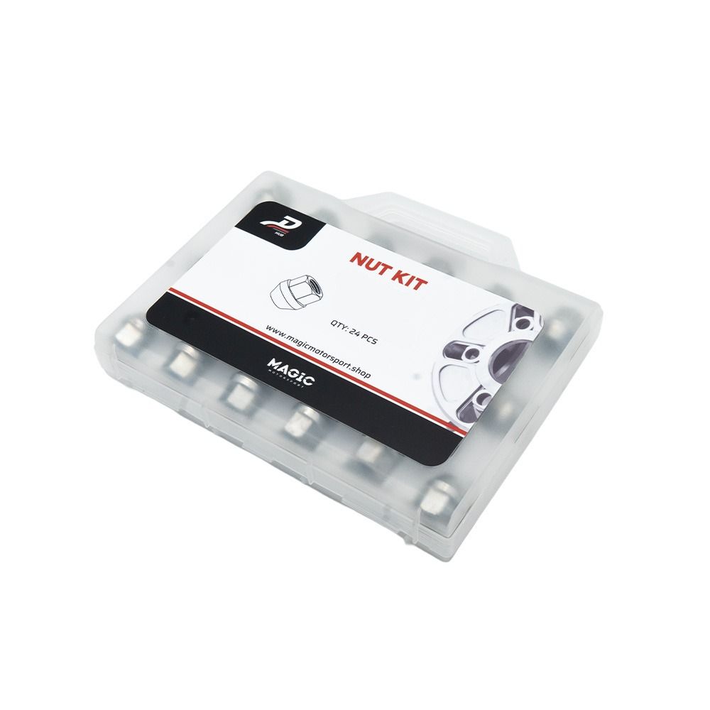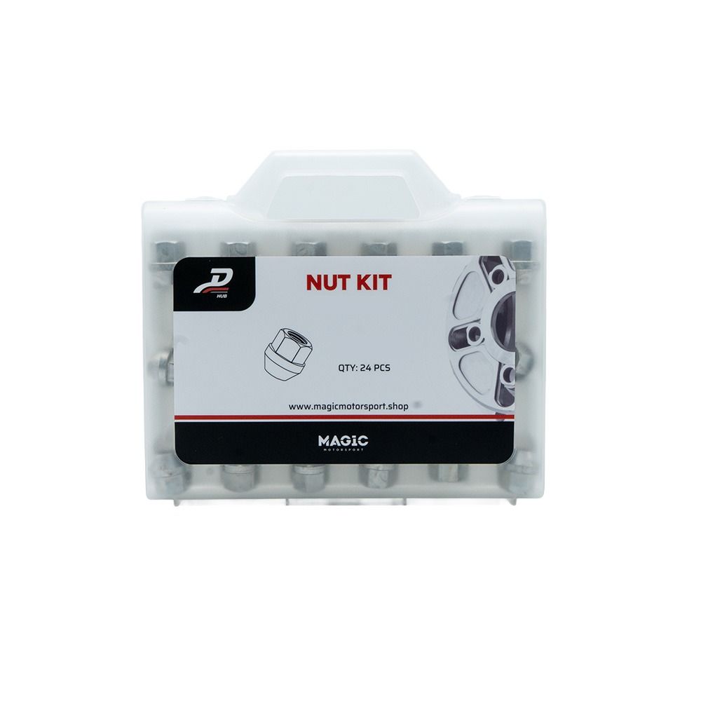 Set of standard nuts for the correct and safe installation of the Dynomag Hub. Designed to avoid compatibility issues caused by non-standard screws or nuts, even when aftermarket wheel hub/braking system components are used.