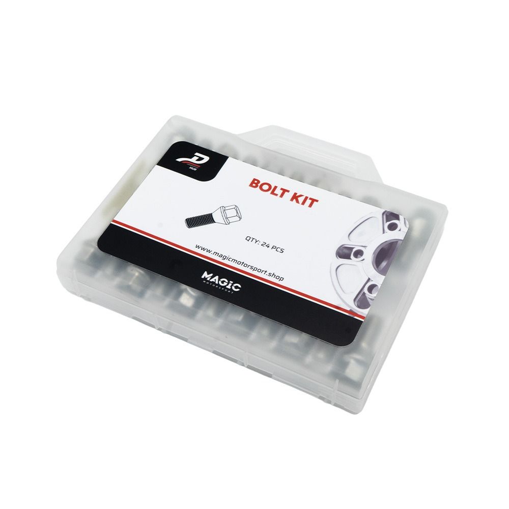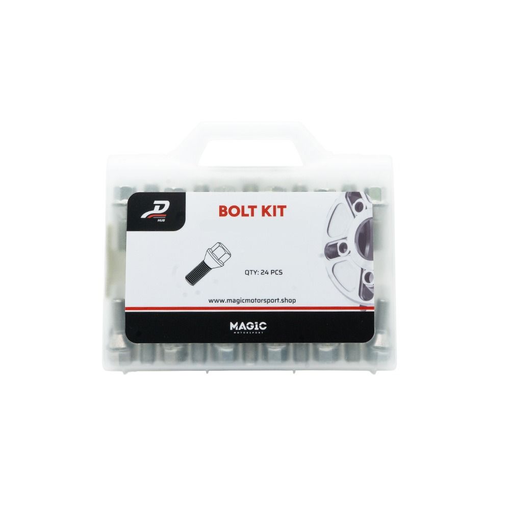 Set of standard bolts for the correct and safe installation of the Dynomag Hub. Designed to avoid compatibility issues caused by non-standard screws or nuts, even when aftermarket wheel hub/braking system components are used.